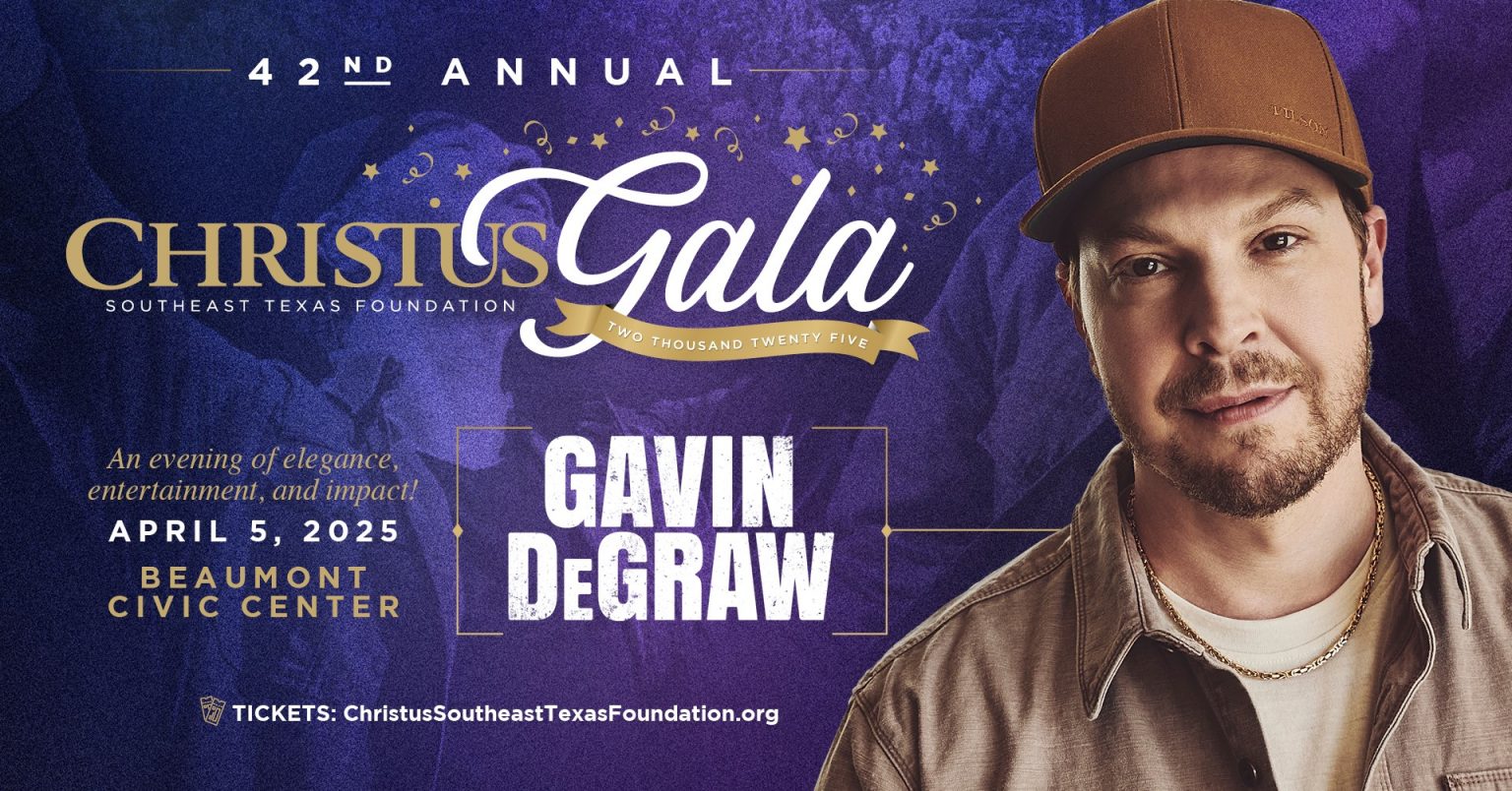 About the Gala: The CHRISTUS Southeast Texas Foundation is thrilled to host the 42nd Annual CHRISTUS Gala on Saturday, April 5, 2025, at the Beaumont Civic Center. This elegant evening promises a night of fun and philanthropy as we come together to support the vital healthcare services provided by CHRISTUS Southeast Texas. For over four decades, the CHRISTUS Gala has been a highlight of the Southeast Texas social calendar, drawing attendees from across the region to support the health and well-being of our community. Guests will enjoy a sophisticated evening featuring a gourmet dinner, table wine, dessert, and live entertainment by Gavin DeGraw, known for hits like “I Don’t Want to Be,” “Chariot,” and “Not Over You.”
